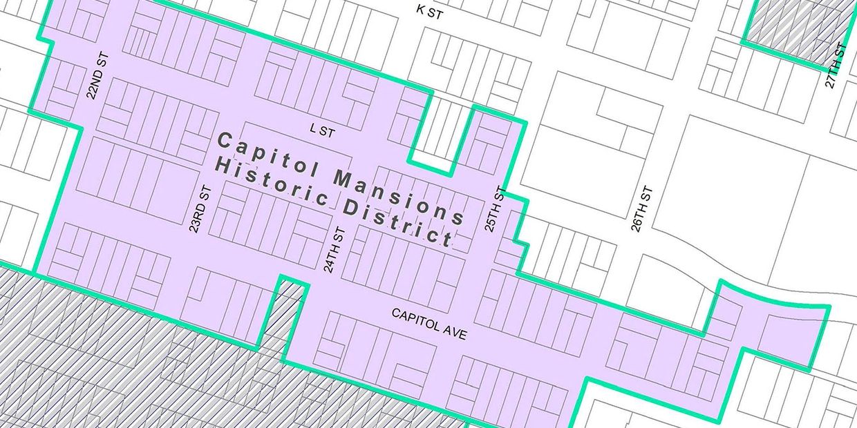 The Capitol Mansions Historic District is roughly bounded on the west side by 22nd Street, by Matsui and Liestal Alleys to the south and north, and by 26th Street to the east, with some outlying buildings also included.